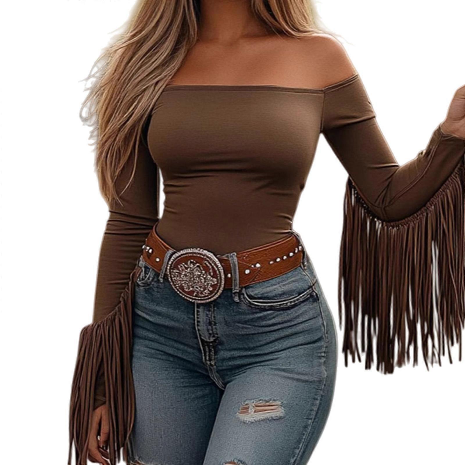 Women's Stretch Fabric Off Shoulder Top with Fringe Long Sleeve Tassels Design Western Cowgirl Shirt for Fall Comfort light brown XL
