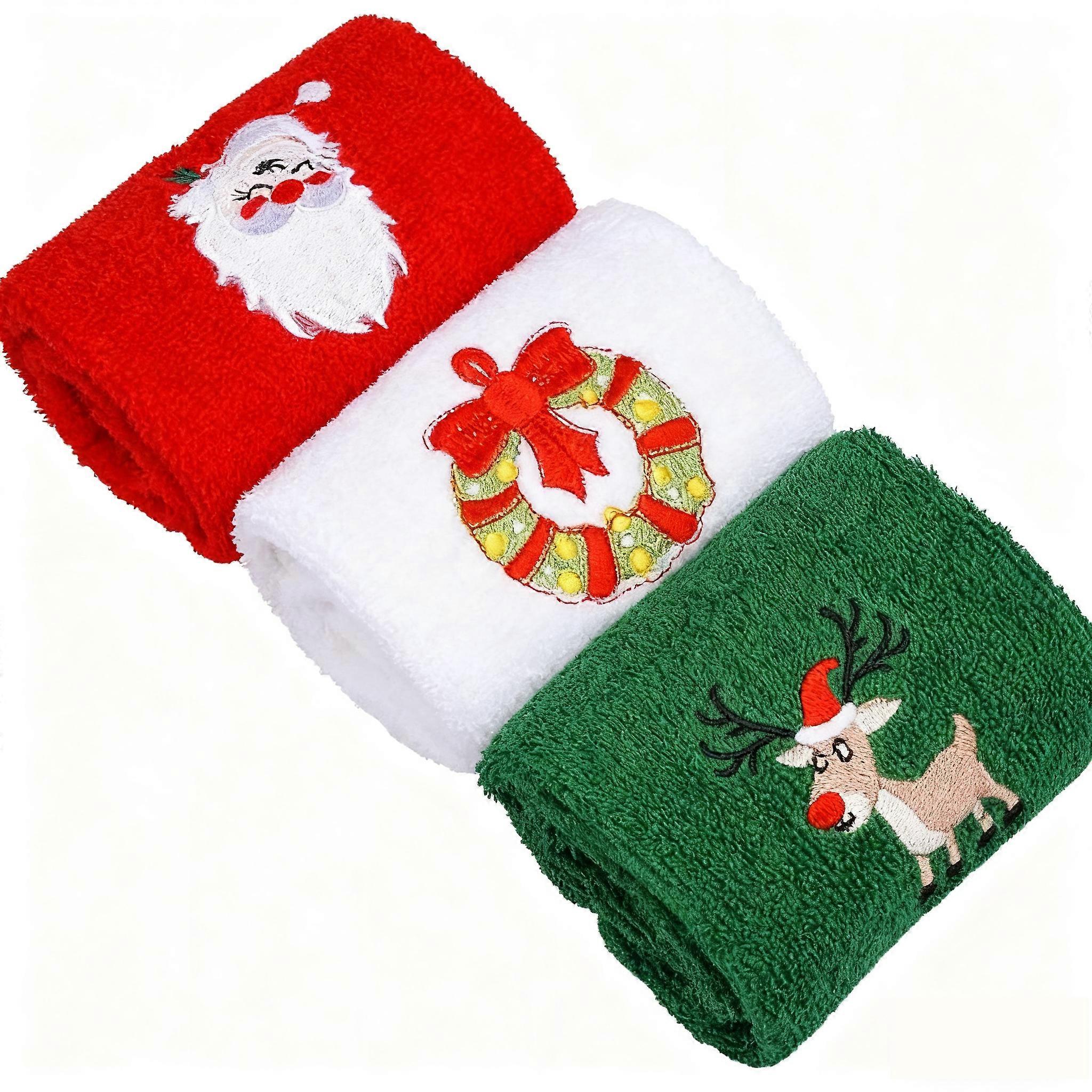 3pcs set of Christmas themed embroidered soft and skin friendly pure Cotton towels suitable for daily kitchen and bathroom use