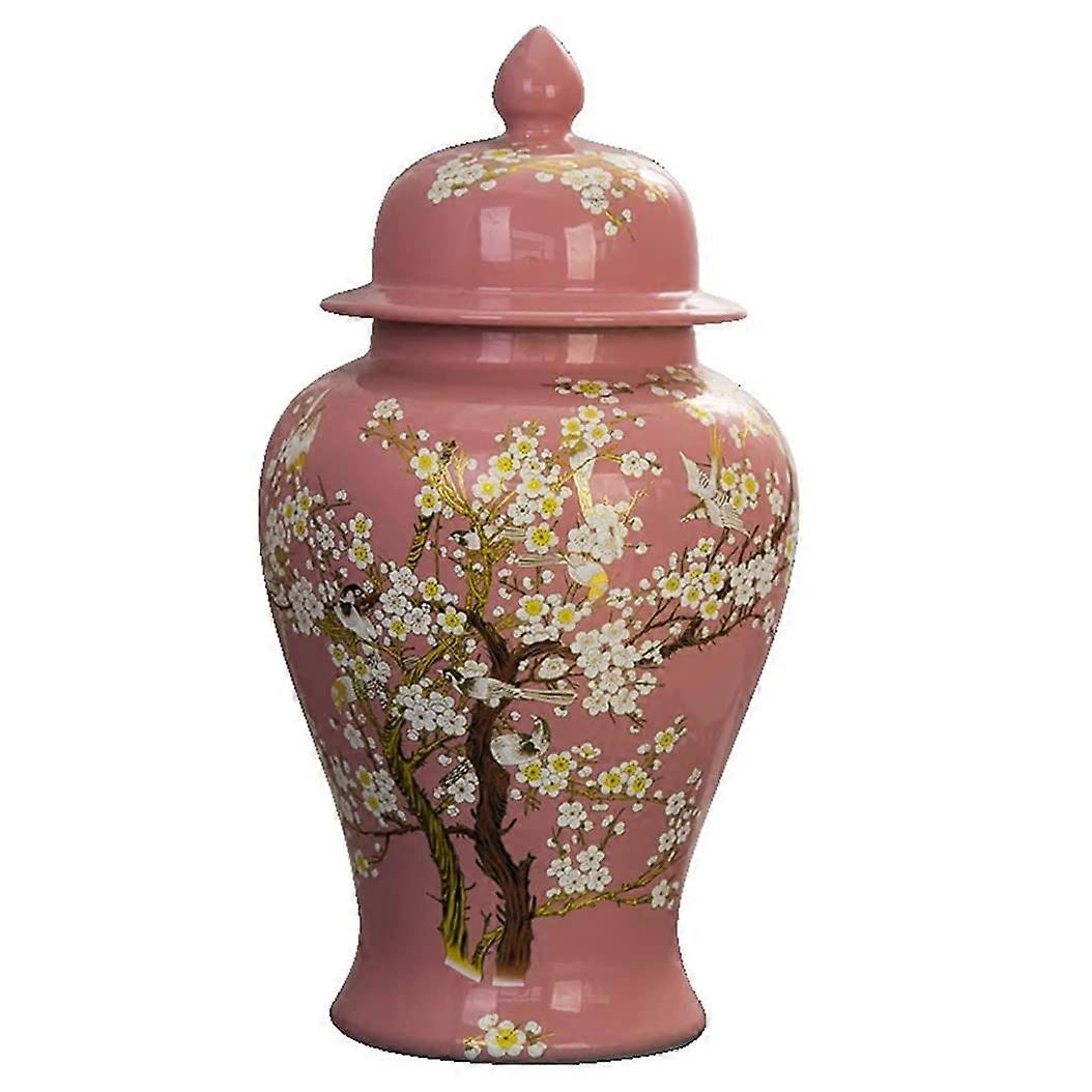 Pink Chinese Ginger Jar with Lid, Porcelain Temple Jar Vase, Tall Floor Ceramic Vase for Home Decor