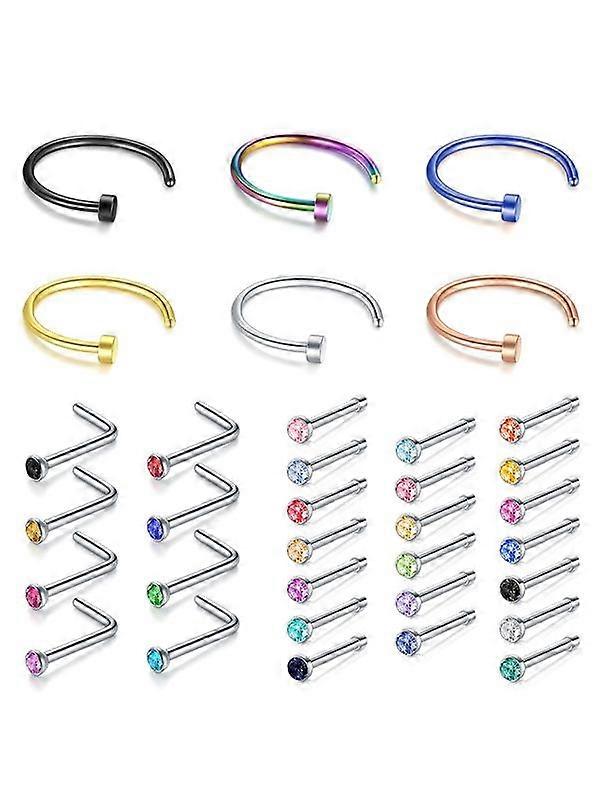 34-Piece Stainless Steel Nose Ring Set, Colorful Rhinestone Studs, Unisex Body Piercing Jewelry, All-Season Fashion Accessories