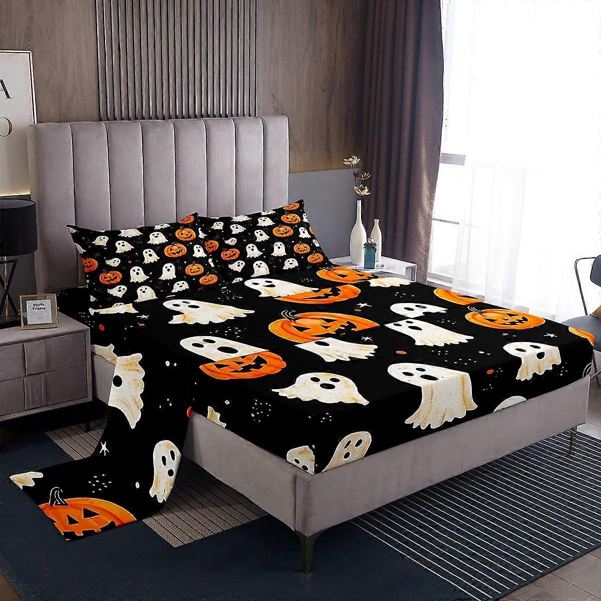 Queen Bed Sheet Set Kids Halloween Pumpkin Ghost Design Deep Pocket Breathable Fabric Black