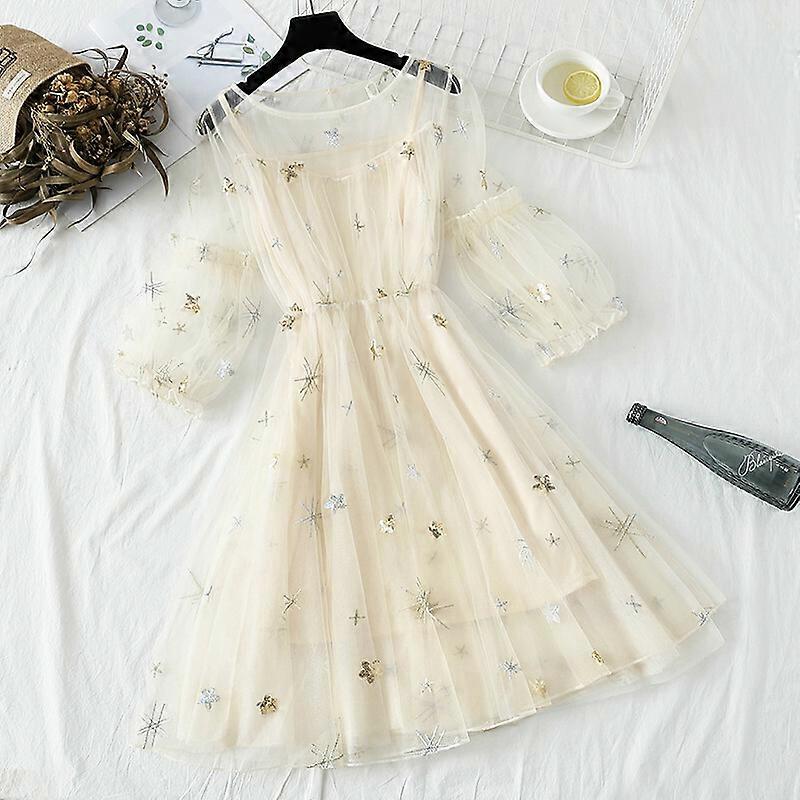 Women Sheer Mesh Tulle Dress Star Sequins Puff Sleeve Midi Elegant Fairy Lolita