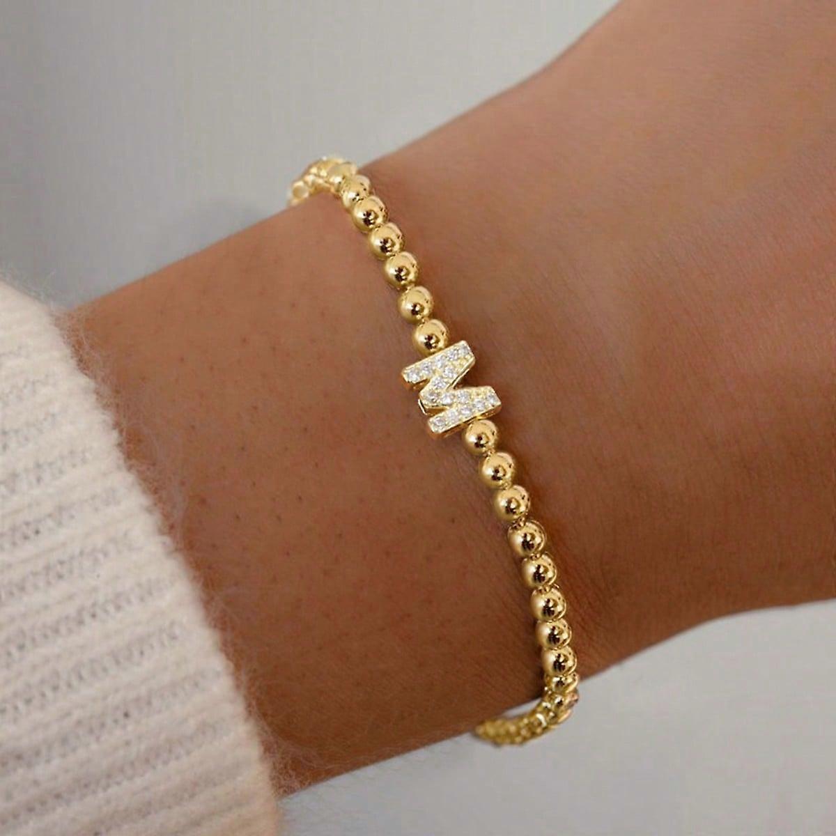 Dainty Simple Pave Zirconia Initial Bracelet for Women Gold Plated Beaded Adjustable Letter Bracelets For Women Birthday Gift