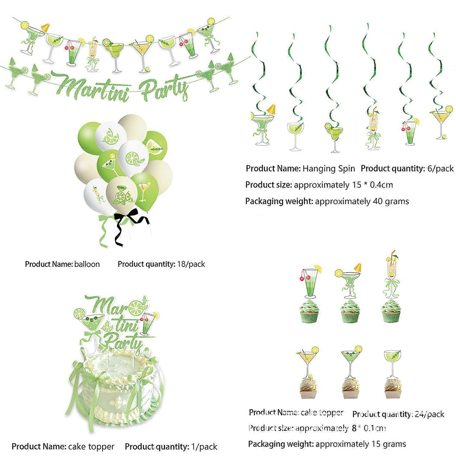 Martini-themed classic cocktails, summer birthday party decorations, banners, cake flags, and hanging ornaments.