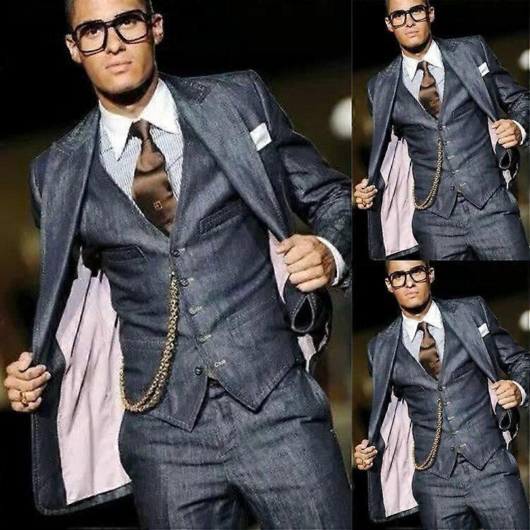 Blue Denim Men Suits 3 Pieces Wide Peak Lapel Formal Slim Fit Vintage Blazers