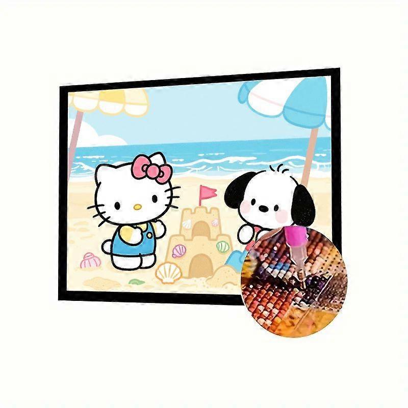 1PC Full Drill 5D Diamond Painting Kit - Cute Cartoon Sanrio Hello Kitty & Pochacco at the Beach Building Sandcastle DIY Diamond