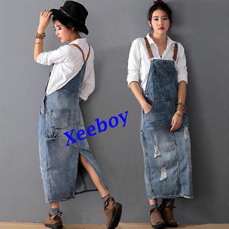 Fashion Womens Casual Loose Washed Denim Suspender Overalls Jeans Jumpsuit Dress