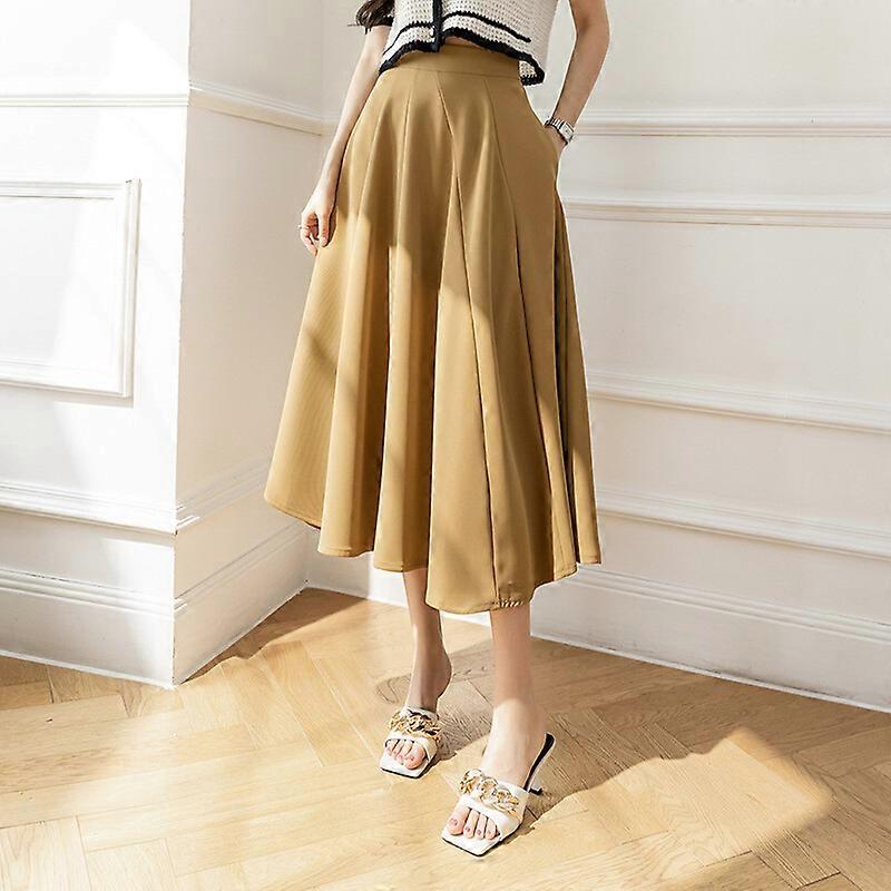 Women A-line High Waist Midi Skirt Pockets Pleated Swing Work Office Loose Skirt