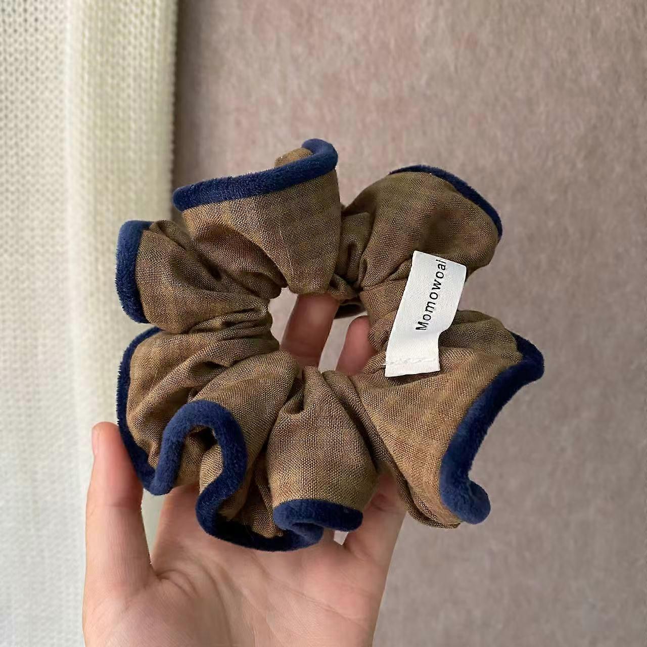 1PC Brown Blue Velvet Trim Scrunchie Vintage Checkered Fabric Hair Tie Soft Elastic Hair Accessory For Women Girls Daily Casual