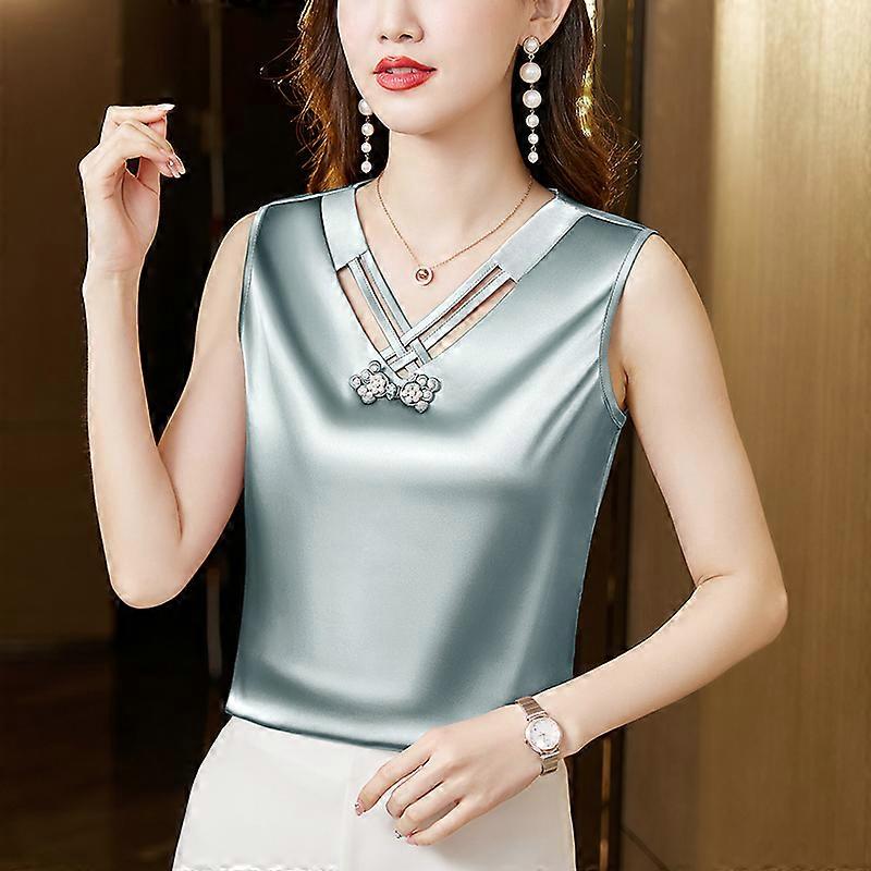 Lady V Neck Satin Faux Silk Vest Soft Camisole Frog Button Sleeveless Tank Top