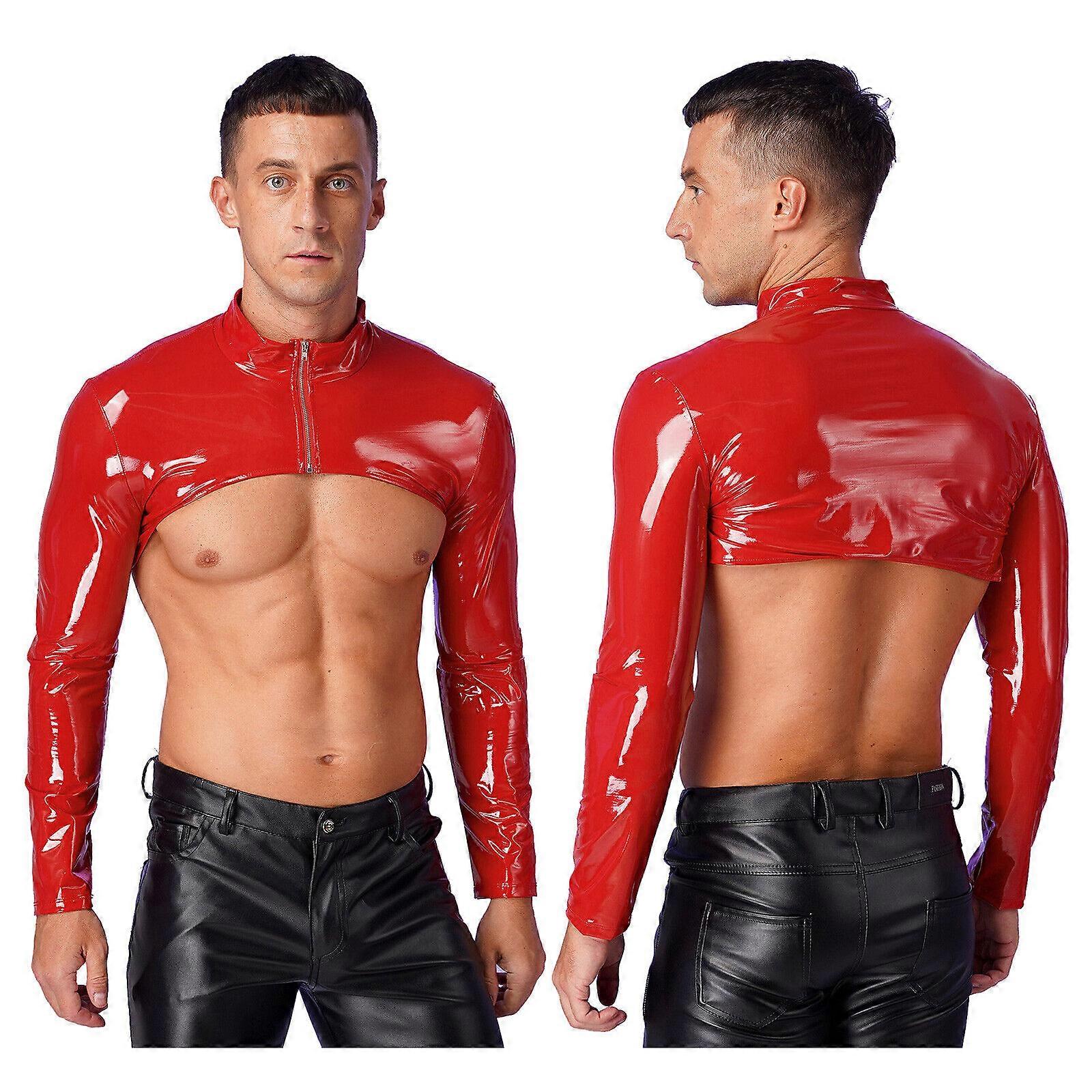 Mans Leather Long Arm Sleeves Open Front Zipper Shrug Half Top Hip Hop Nightclub