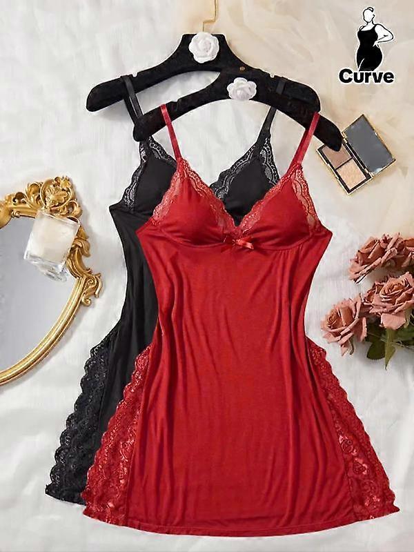 Plus Size Contrast Lace Split Thigh Cami Nightdress, Casual Soft Comfortable Spaghetti Strap Nightgown for Women, Women's Sleepwear for All