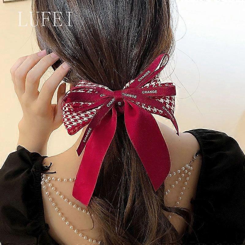 1pc houndstooth bow large elastic hair band with flowing ribbon, French high-end hair tie for ponytails and buns hair accessory