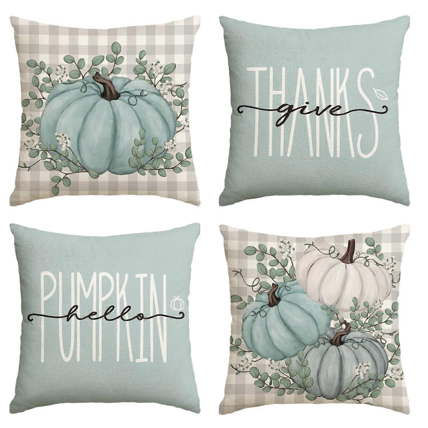 Sm:)e Thanksgiving Blue Pumpkin Give Thanks Eucalyptus Leaf Fall Throw Pillow Covers 18 x 18 Set of 4