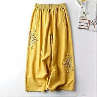 Retro Women Embroidery Ankle Pants Elastic Waist Wide Leg Trousers Casual Loose