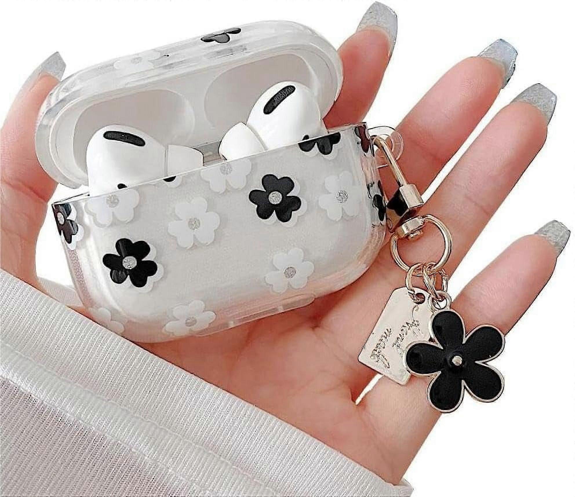 Compatible with AirPods 3rd Gen Clear Case, Cute Cartoon Flower Cover with Keychain, Soft TPU for Girls Women - Black