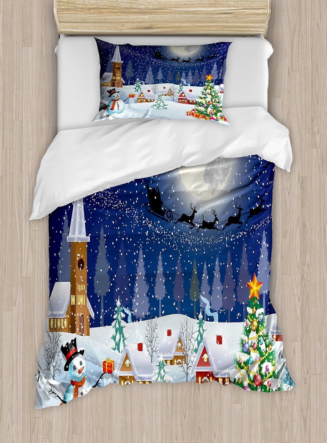 Christmas Twin Duvet Cover Set, Snowman Xmas Tree Santa Sleigh Moon Present Boxes Snow Stars, 2 Piece Blue White Bedding Set with 1 Pillow Sham by