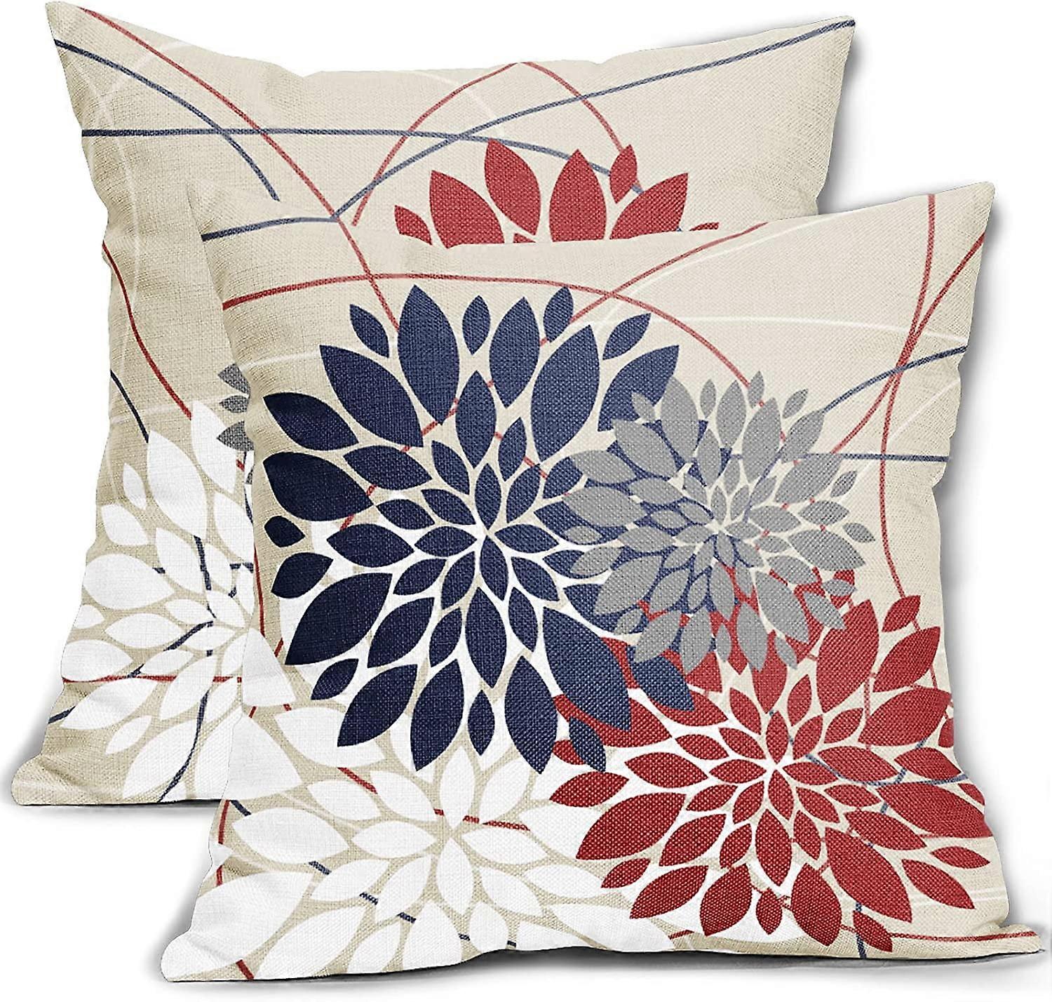 Red Blue 20x20 Inch Dahlia Flower Pillow Covers, Modern Geometry Floral Linen Square Cushion Case Set of 2, Compatible with Outdoor Farmhouse Decor