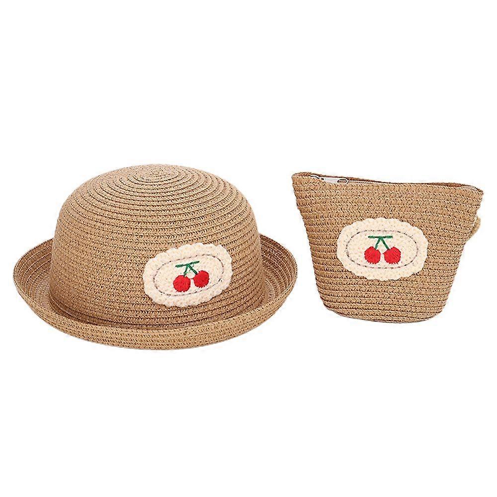 Material: Papyrus Color: Khaki, pink, milky white, beige Cap circumference size: 52-54cm The set includes: 1*children's sunscreen cap, 1*straw bag 1. The sunscreen hat has a brim, which has good shading and windproof properties, blocks sunlight and protects the facial skin. 2. It is comfortable to wear, light in weight, woven from grass, breathable, quick-drying, absorbs sweat and stays dry. 3. The hat has a windproof rope, which is stable to wear, not easy to be blown off by the wind, and durable.The circumference of the hat can be adapted to the head size of most children. 4. It is light in weight and foldable. The bag is enough to hold children's belongings and can be hung on the body. It is easy to carry and store, and easy to use.The cute cherry decoration makes it more attractive. 5. Suitable for most outdoor activities in summer, such as fishing, tourism and camping, boating, shopping, going to the beach, etc.