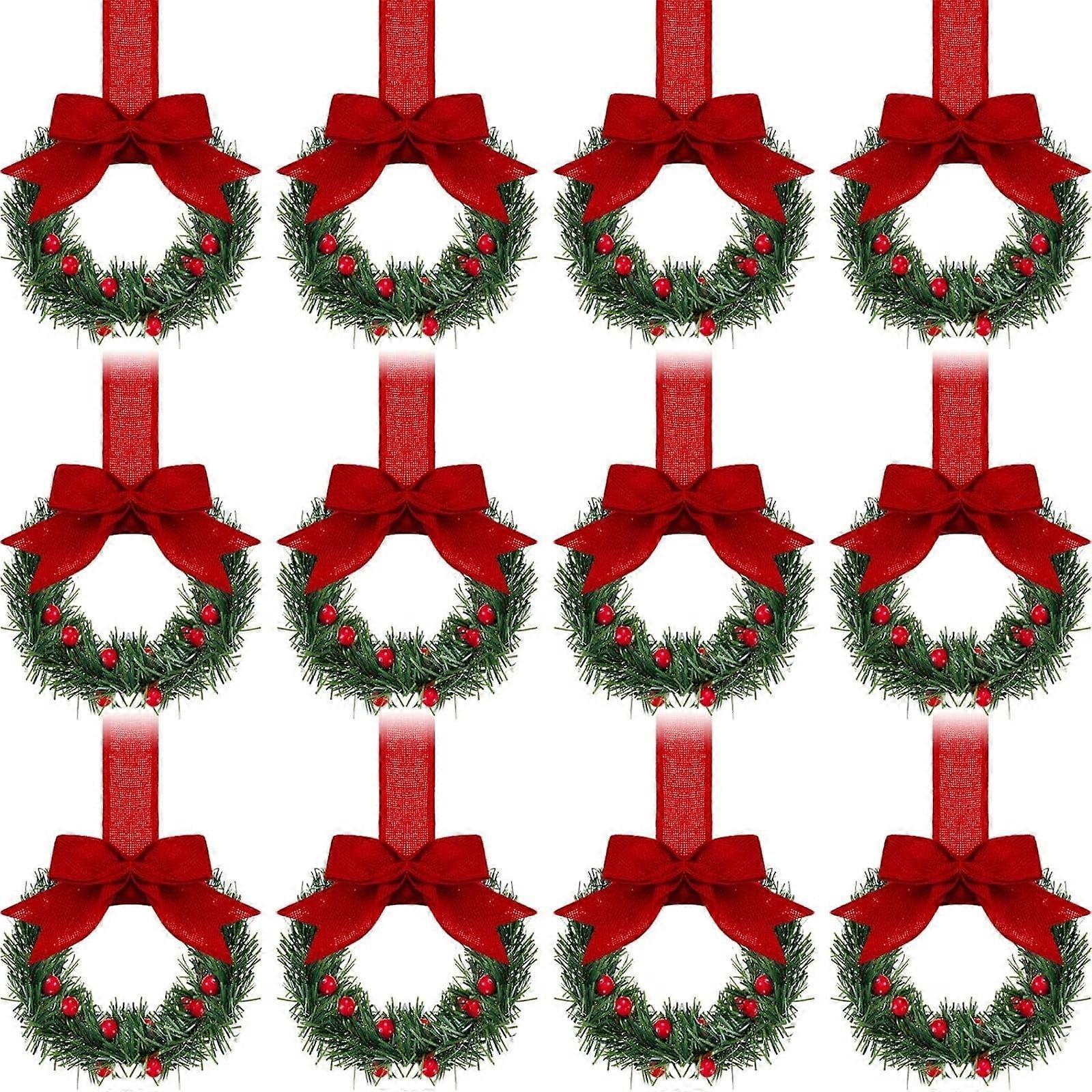 12 Pcs Christmas Wreaths 5.12" with Ribbon, Greenery Mini Wreaths for Kitchen Cabinet, Window, Door Decor (Red, Classic Style)