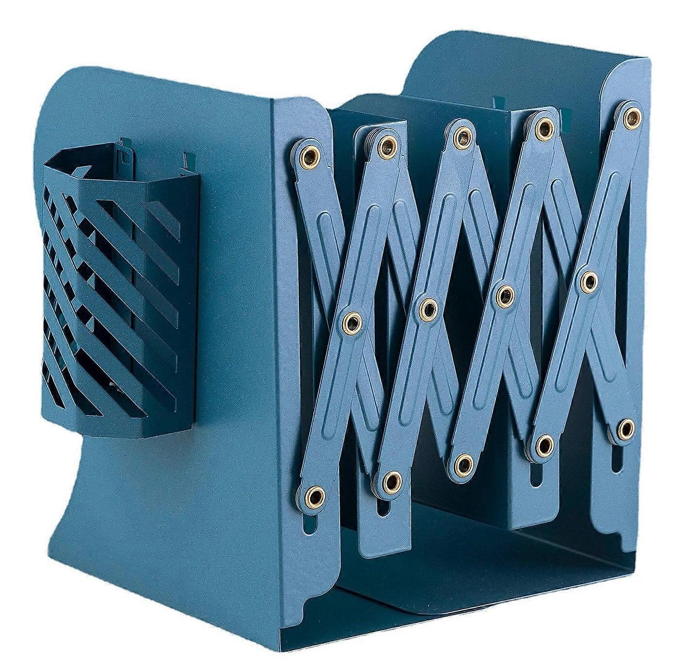 Retractable Book Stand with Pen Holder, Adjustable Metal Bookends, compatible with School Office Supplies (Blue)