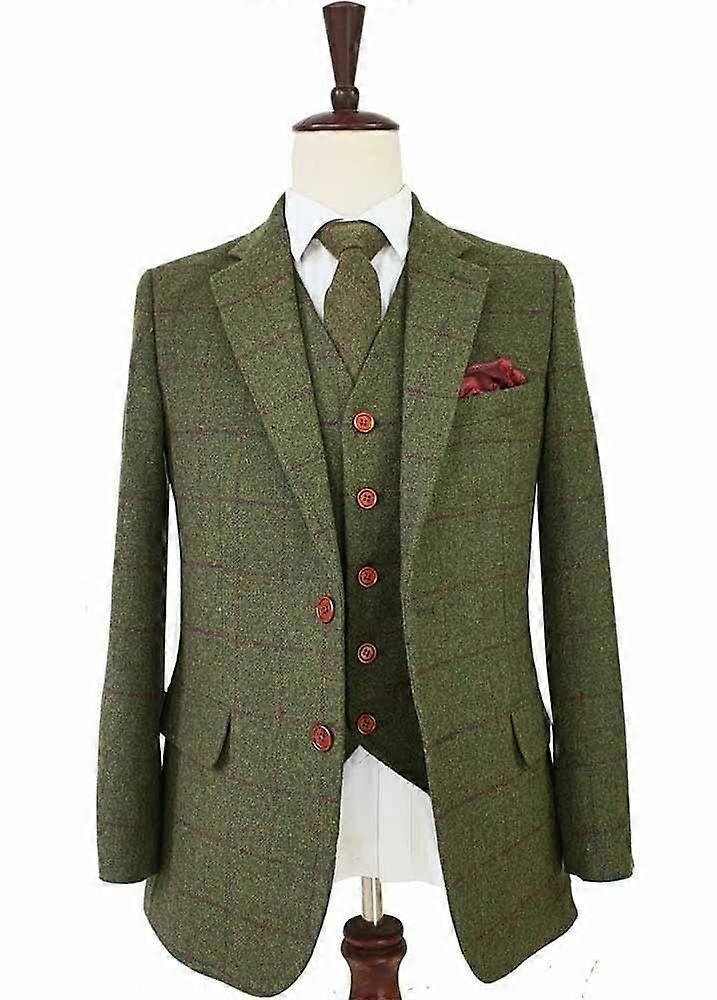 Olive Green Plaid Men Tweed Suit Vintage Hunting Groom Tuxedo Prom Party Blazer