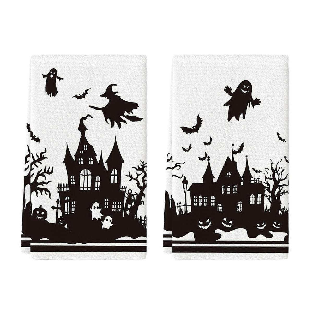 Sm:)e Haunted House Tree Black White Spooky Ghost Witch Halloween Kitchen Towels Dish Towels 18x26 Inch Set of 2