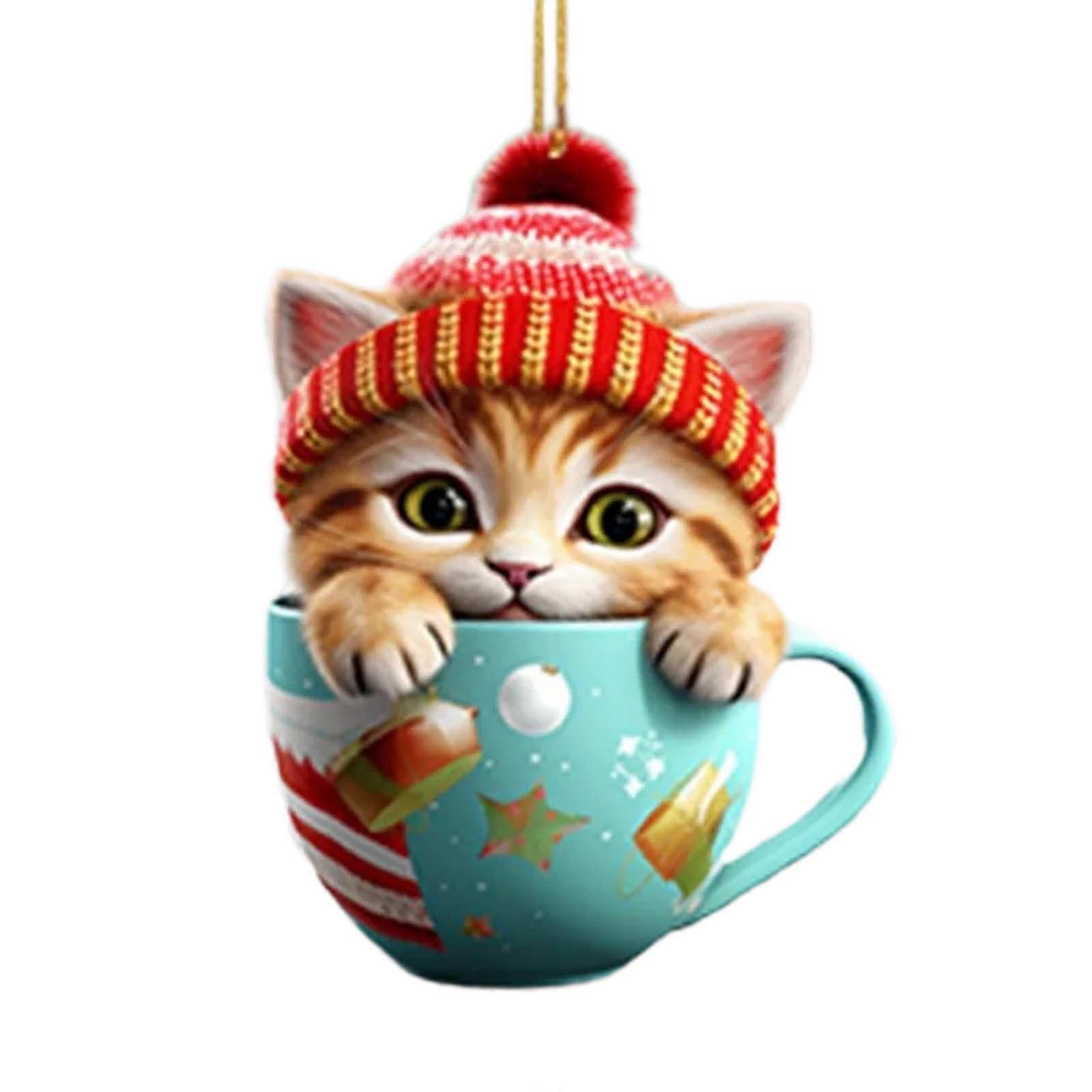 Cute Teacup Cat Christmas Ornaments, Kitten Snowflake Hanging Decorations Compatible with Mini Trees, Vintage Holiday Party Supplies
