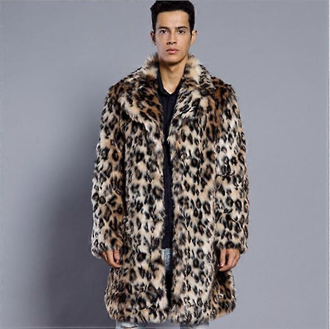 Men Jacket Faux Fur Coat Lapel Warm Leopard Mid Long Outwear Winter Parka Coats