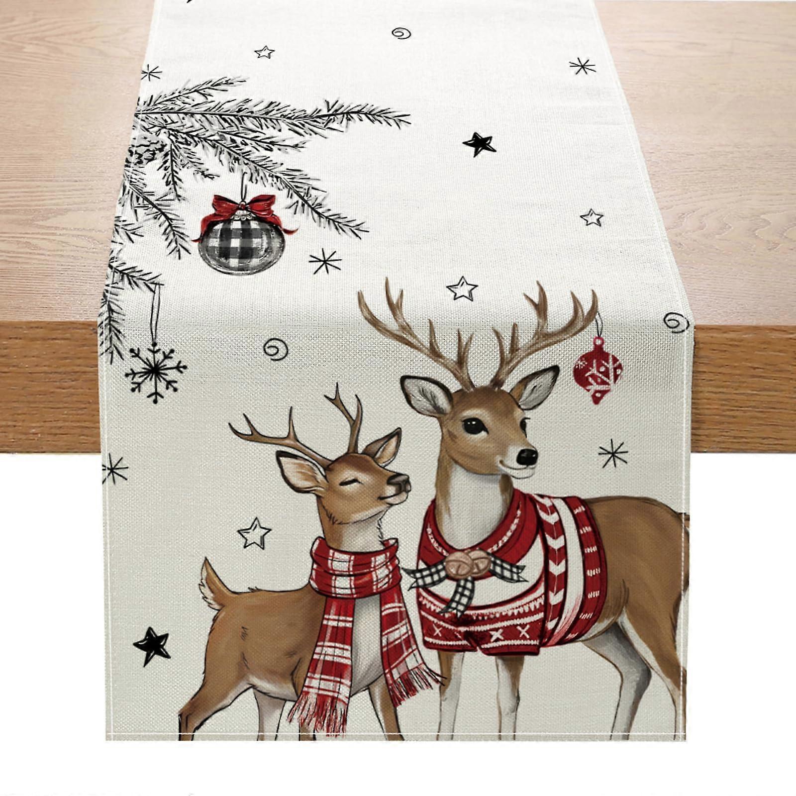 Christmas Table Runner 13x72 Inch with Festive Deer Pattern and Snowflakes for Winter Holiday Décor