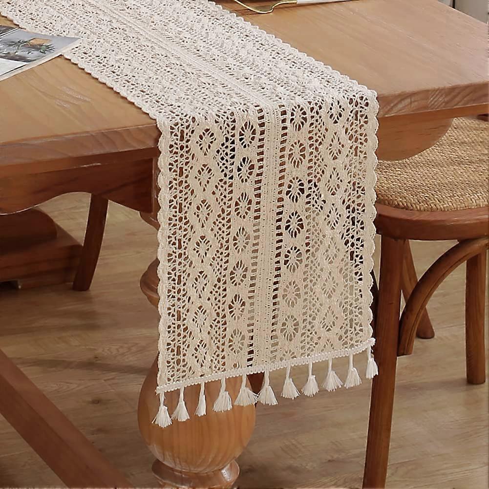 Crochet Lace Table Runner with Tassels, 10x48 Boho Cotton Rustic Farmhouse Wedding Decor