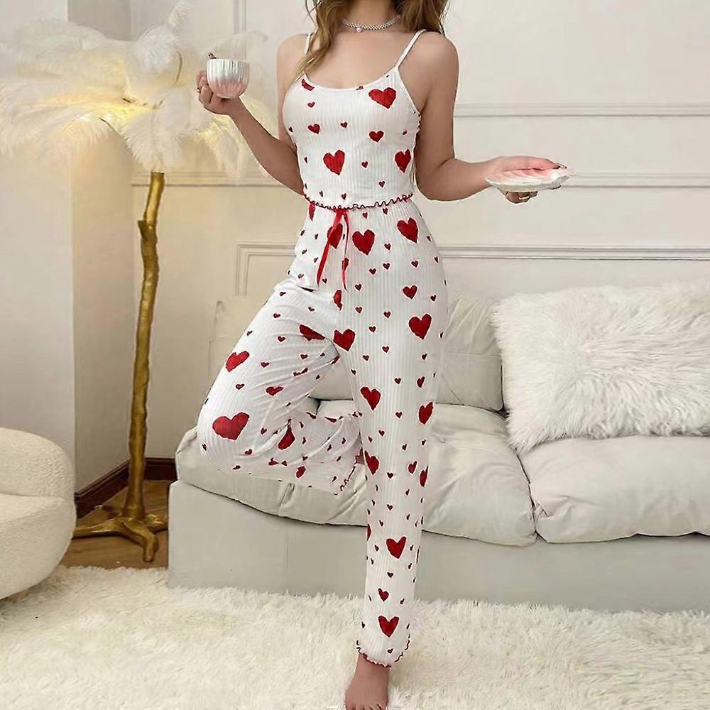 New Backless Pajamas Set Heart Print Elastic Leisure Suit Polyester Sling Pants Womens