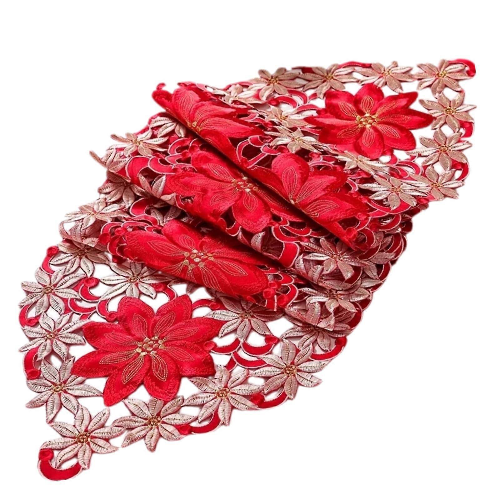 Extra Large Christmas Table Runner 86 Inch Red and Gold Mistletoe Poinsettia Embroidery