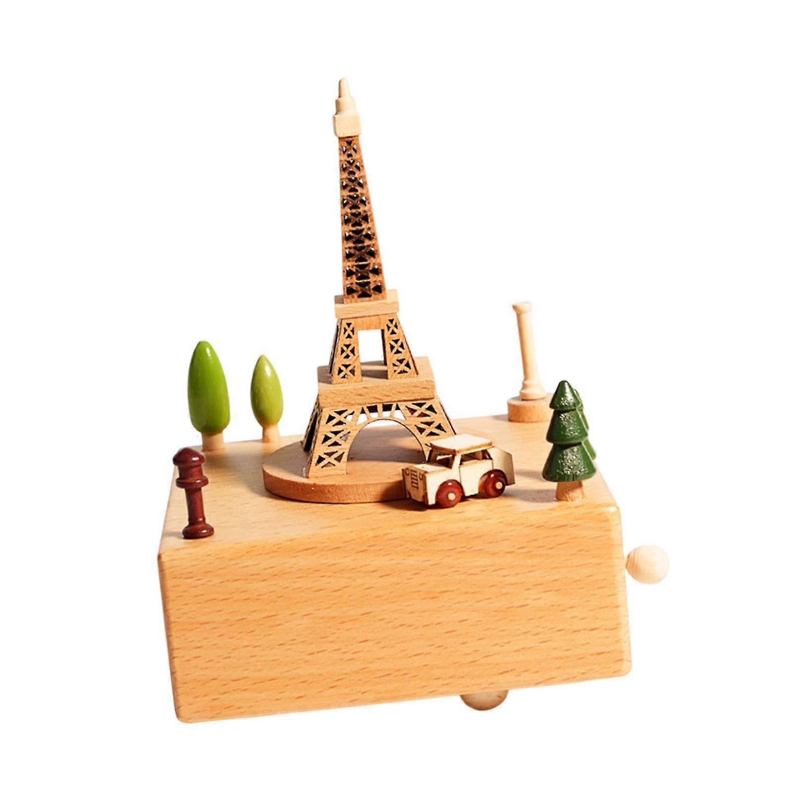 Wooden Music Box with Rotating Paris Car Scene, WindUp Melody, Handmade Gift for Girls