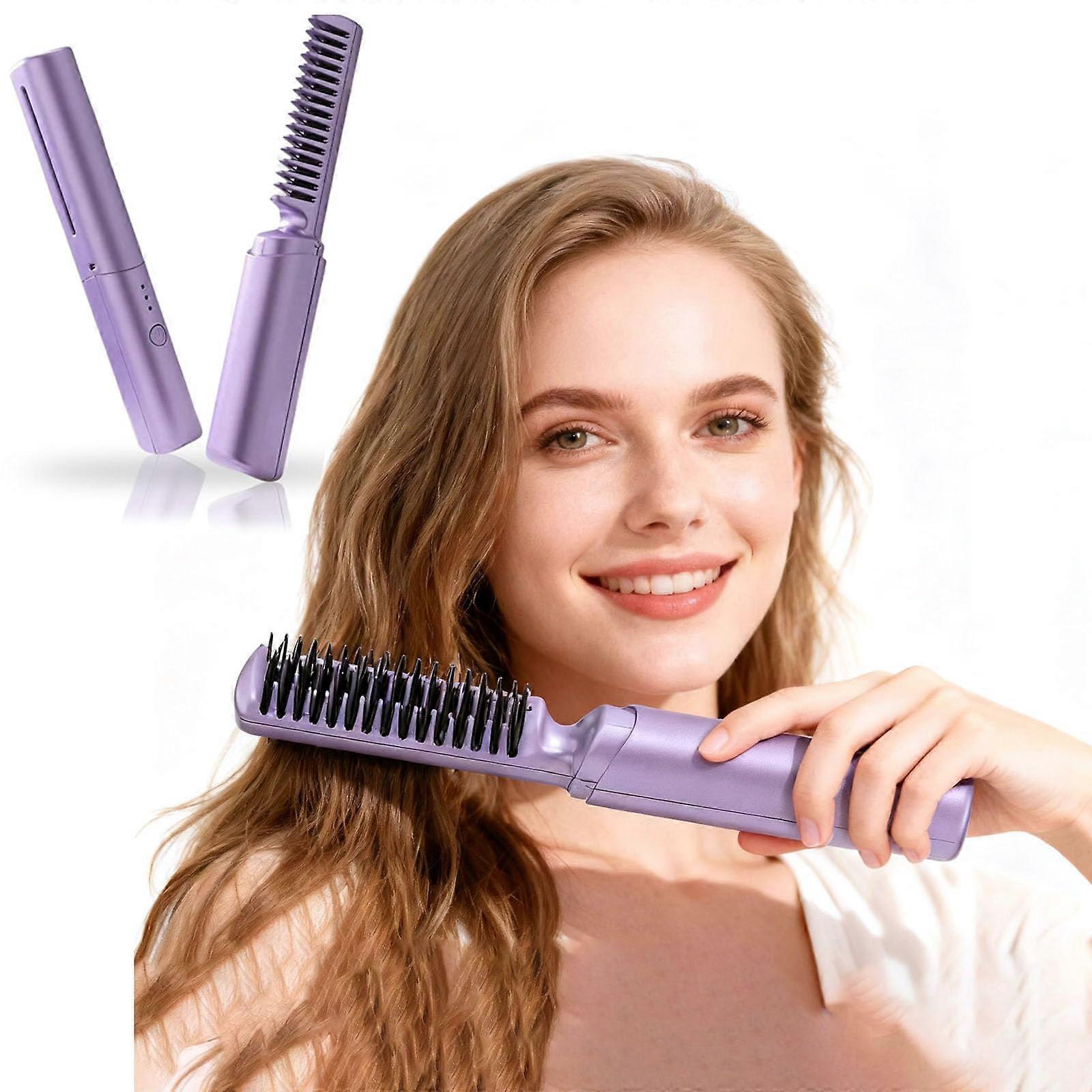 Wireless Hair Straightener Ceramic 2in1 Curling Comb USB Rechargeable Frizz Purple