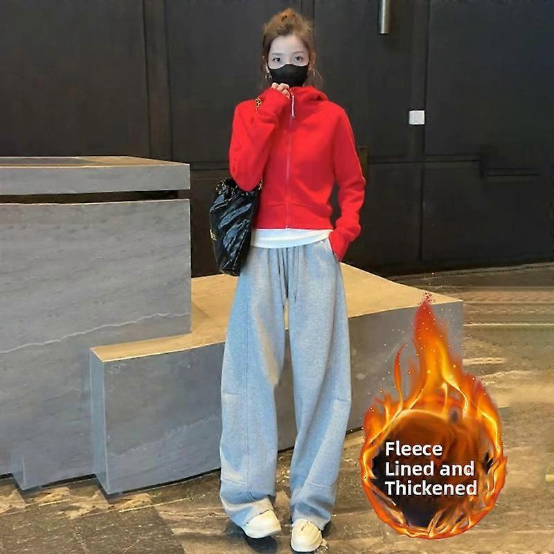 Korean Sle Winter New All-Match Hooded Zipper ort Sweatirt Jaet Thiened Fce Warm Casual Pants Set Women's Faion