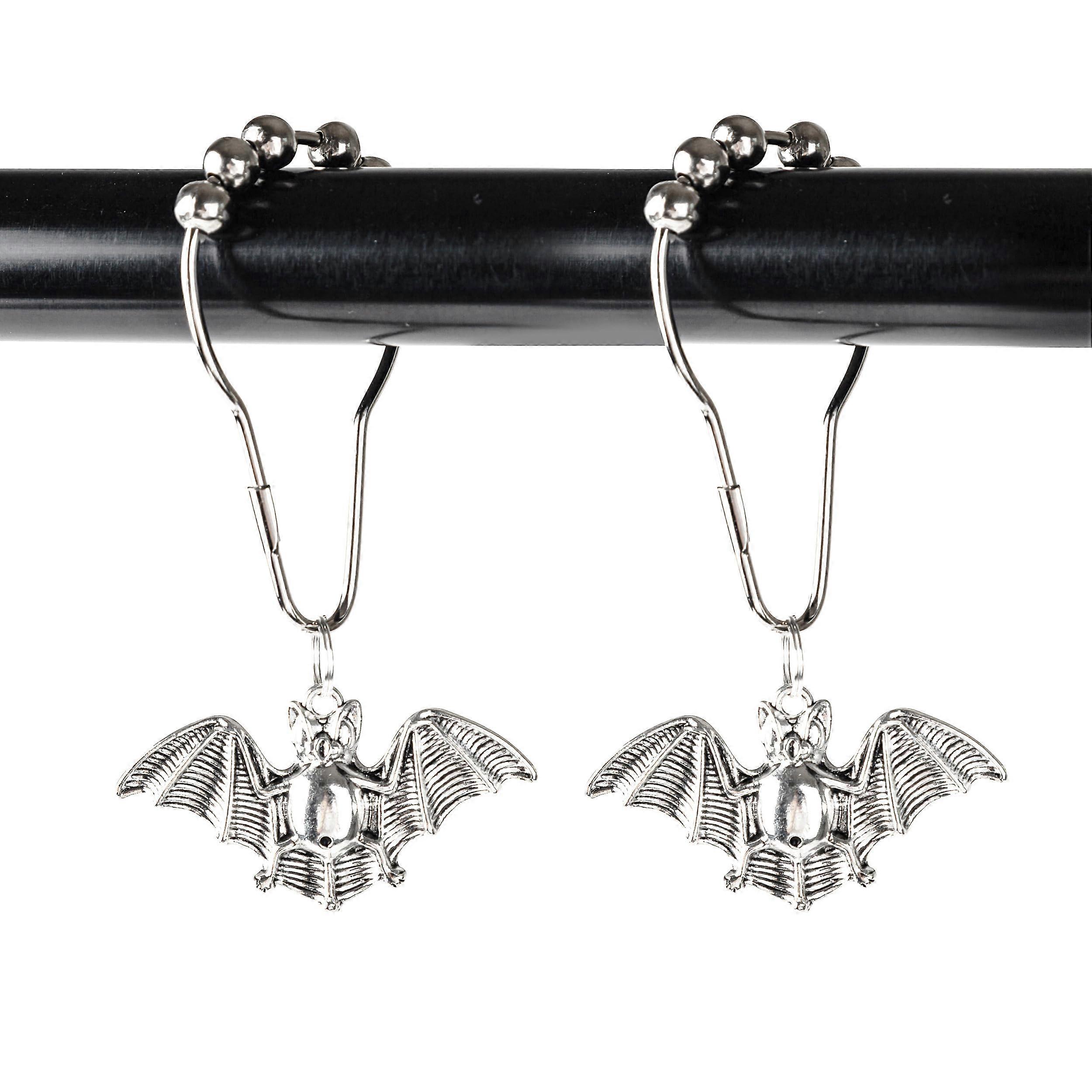 Shower Curtain Hooks with Decorative Bat Pendants Quality Materials: Each hook is crafted from durable stainless steel for longlasting strength and resistance to rust. The decorative bat pendant is made from sturdy zinc alloy, giving it a unique, eyecatching finish that enhances your bathroom decor. Smooth Sliding Performance: Featuring a fiveball roller design, these hooks glide effortlessly across straight or curved shower rods. Reduced friction ensures quiet operation, while protecting your shower curtain rod and curtain from scratches or damage. Fit: Designed to fit shower curtain rods with a diameter of 22–25 mm (0.8–1.1 inches). Includes a set of 12 batthemed hooks, providing full coverage for standard shower curtains. Functional and Decorative: The bat pendants add a distinctive touch to your bathroom while keeping curtains securely in place. Ideal for everyday use as well as special occasions. Versatile Applications: 1. Add a stylish, gothic accent to your home bathroom while ensuring smooth curtain movement. 2. Create a striking thematic decoration for Halloween parties or haunted house setups. 3. Use as part of seasonal or themed bathroom decor to surprise and delight guests. These shower curtain hooks combine practical performance with distinctive decorative appeal, making them a reliable and attractive addition to any bathroom setup.