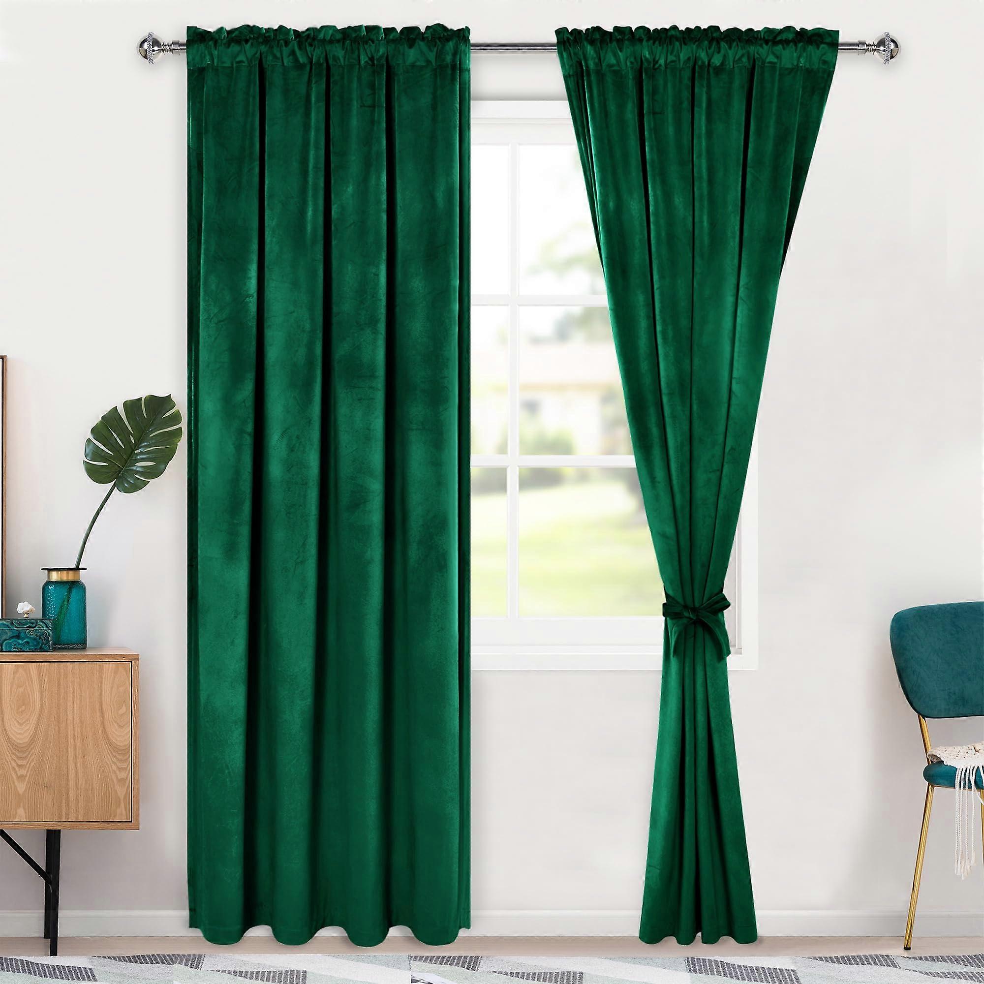 Green Velvet Blackout Thermal Insulated Curtains 84 Inch with Tiebacks, Set of 2 for Bedroom