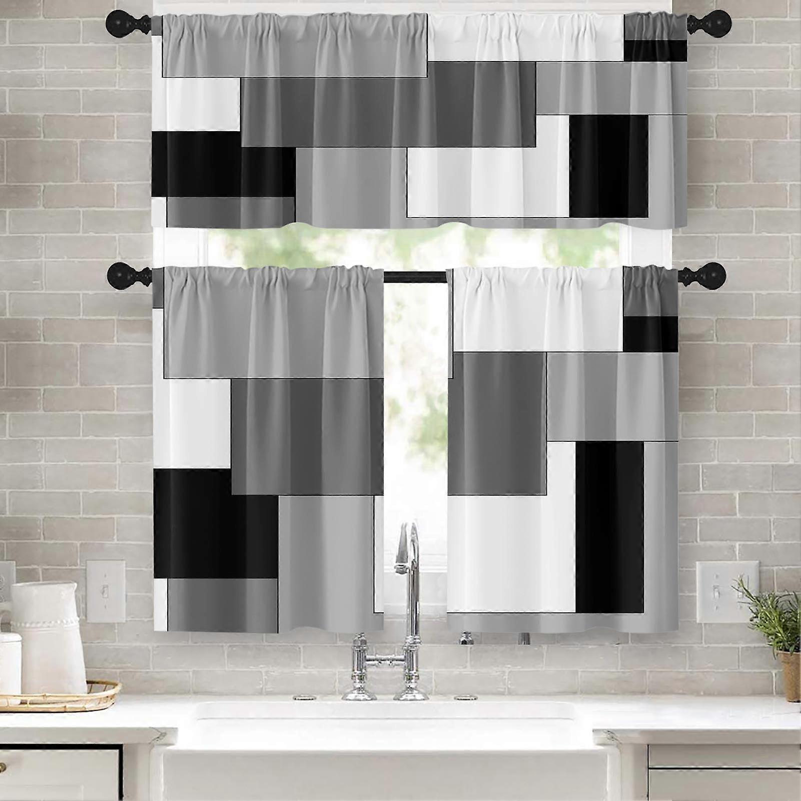 Kitchen Curtains Set 36 Inch Gray Geometric Rod Pocket Valance and Tier for Privacy and Light Control