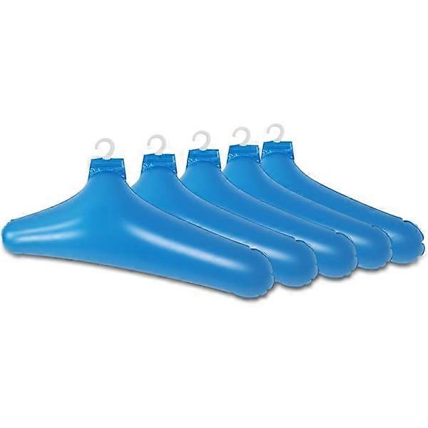 Inflatable Hanger Travel X 5-pack in blue, a must-have for hanging dried fabric clothes! With rounded edges that prevent \"hanging creases \" at the shoulder of wet or dry garments. Separates the front of the garment from the back, improving airflow for faster drying of clothes. Foldable clothes hanger is ultra-light, does not burden or damage wardrobes. Foldable clothes hanger is ultra-light, does not burden or damage wardrobes. Portable, non-slip, foldable, perfect travel accessory, fits neatly in your luggage when deflated for space-saving storage, suitable for home, car, camping indoors and outdoors. Product Description Specifications: SIZE:18.1X8.7 inches Color: Blue A perfect travel accessory, takes up very little space in your luggage when flat and folded. HOW TO USE: NOTE: An anti-leak valve under the air blowing nozzle; 1. Open the hangers completely flat, not folded. 2. Press the air nozzle firmly to make the connected anti-leakage valve inside RELEASED. 3. Blow the air until the hangers are sufficiently inflated. 4. RELEASE the nozzle to make the valve inside hold the hole to prevent air leakage. 5. Cover the lid quickly for the strongest hanger for easy use. Including inflatable soccer post and ball, inflatable lounger, inflatable bumper balls, inflatable pillow, inflatable footrest and inflatable punching bag, etc. All items are made of high quality materials that are non-toxic and tested to ensure your safety_HHH