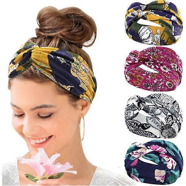 4-pack women's boho style cross headbands, floral headband, stretchy yoga headbands for women