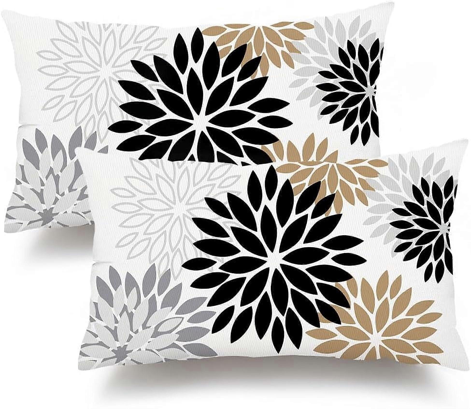 Black Brown Pillow Covers 12x20 Inch Set of 2, White Gray Flower Throw Pillows, Farmhouse Outdoor Modern Floral Linen Cushion Cases for Living Room