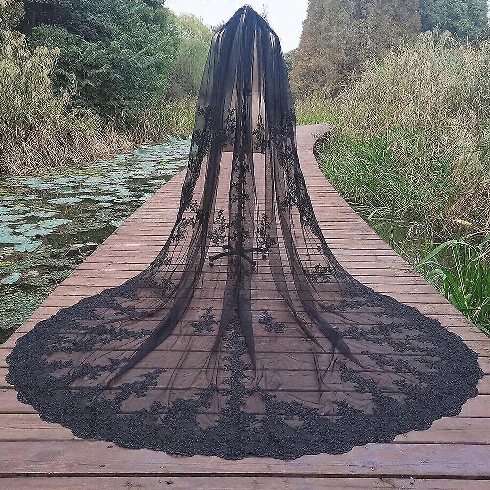 Black Wedding Veils Gothic Lace Appliques Cathedral Bridal Veils with Comb 3M+