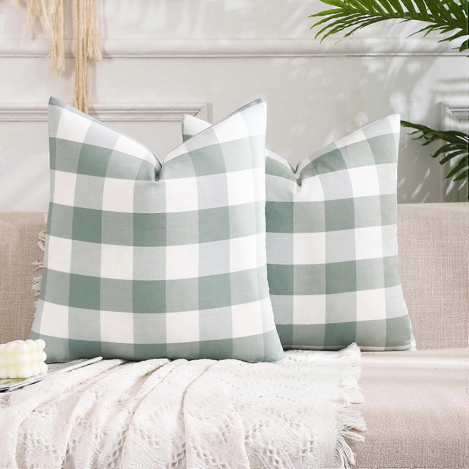 Farmhouse Striped and Plaid Decorative Throw Pillow Covers for Spring Summer Fall and Winter Outdoor Decorations FEATURES FABRIC: Soft quality polyester, not easy to wrinkle, fade or deform. Medium thickness. SIZE:18x18 inch, suit for 18x18 or 20x20 inch pillow inserts. The 20x20 inch inserts will make them more plump. APPLICATION:indoors (bedding, sofa etc.) or outdoors (garden chair, hanging chair, deck chair, etc.) WASH TIPS:Hand washing or Machine Wash Cold Separately, Gently Cycle Only, No Bleach, Tumble Dry, Do Not Iron. NOTICE:PATTERN ON BOTH SIDES, PILLOW COVERS ONLY, INSERTS NOT INCLUDED. As the invisible zipper is in the middle of the bottom, please remember to fold the pillow insert in half and insert it into the pillowcase. Please understand that there will be about 0.5 inch deviation because of hand-cutting and sewing. ★Only Farmhouse Pillow Covers★ Set of 2 green buffalo check throw pillow covers 18x18 inch. No Insert or Filler included, you need to buy the pillow inserts separately, 18x18 inch or 20x20 inch pillow inserts are both okay. ★Farmhouse Plaid Design★ The classic double-sided buffalo plaid pattern pillow covers are perfect for decorating living room, bedroom, patio furniture, porch swing, balcony, car, office and etc. They can fresh your home in a moment, which is easy to mix and match with other farmhouse room decor. Great for both indoor and outdoor use. ★Fabric Similar to Soft Burlap★ Made of 100% polyester material, soft and strong canvas-like, not scratchy at all, no fading or abrasion, can be used as outdoor pillows. ★Gray Green Color★ The color of the pillow cover is a neutral gray-green, warm and elegant. Invisible zipper will not decrease the beauty of these outdoor green throw pillow covers. Hidden zipper on the edge is durable, works smoothly, and can easily withstand frequent disassembly and filling. ★Washing Tips★ Suggest washing before you use these sage green plaid throw pillow covers. Hand wash or machine wash separately in cold water on the gentle cycle, tumble dry low, do not bleach.