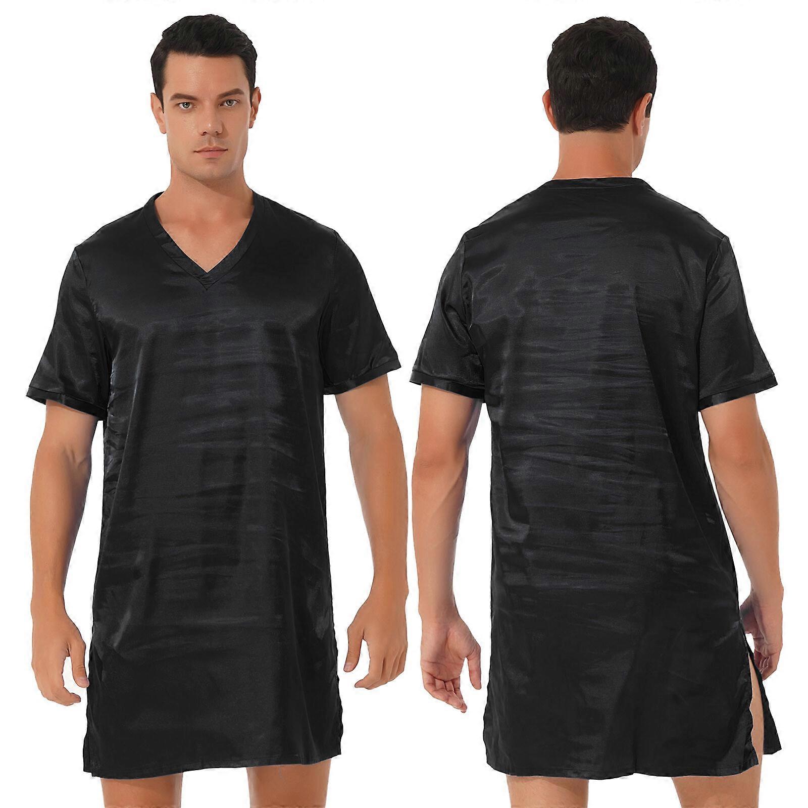 Men's Satin Nightgown Short Sleeve V-Neck Sides Split Indoor Shirt Sleepwear