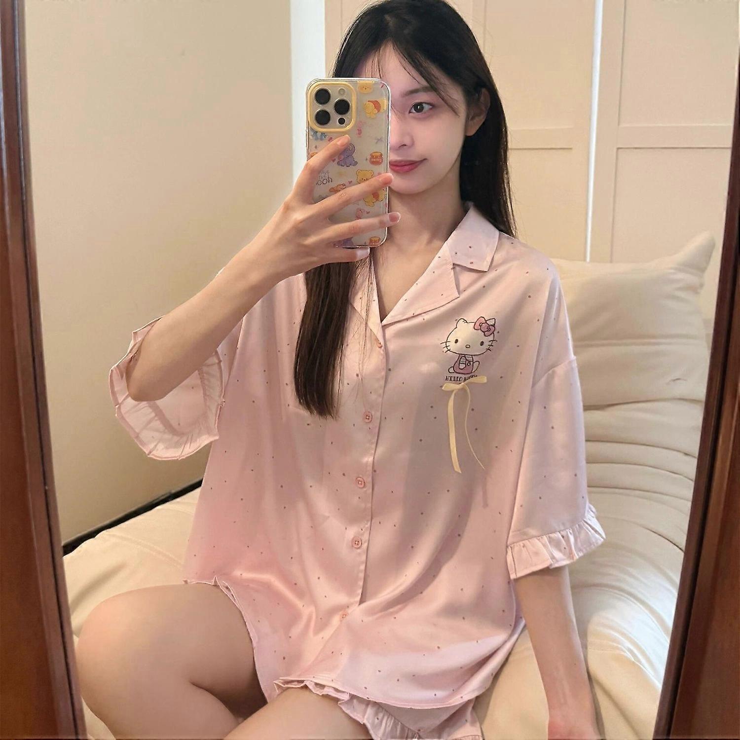 Kawaii Sanrios Anime Hello Kitty Women Pajamas Stripe Girl Print Pajamas Spring Cartoon Sweet Casual Short Sleeved Pajama Sets