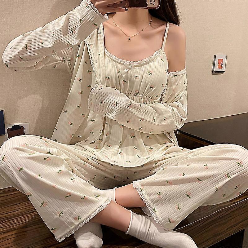 Fdfklak New Ladies Pajamas Set 3Pcs Cardigan+Camisole+Pants Cotton Femme Sleepwear Spring Autumn Comfort Loose Homewear