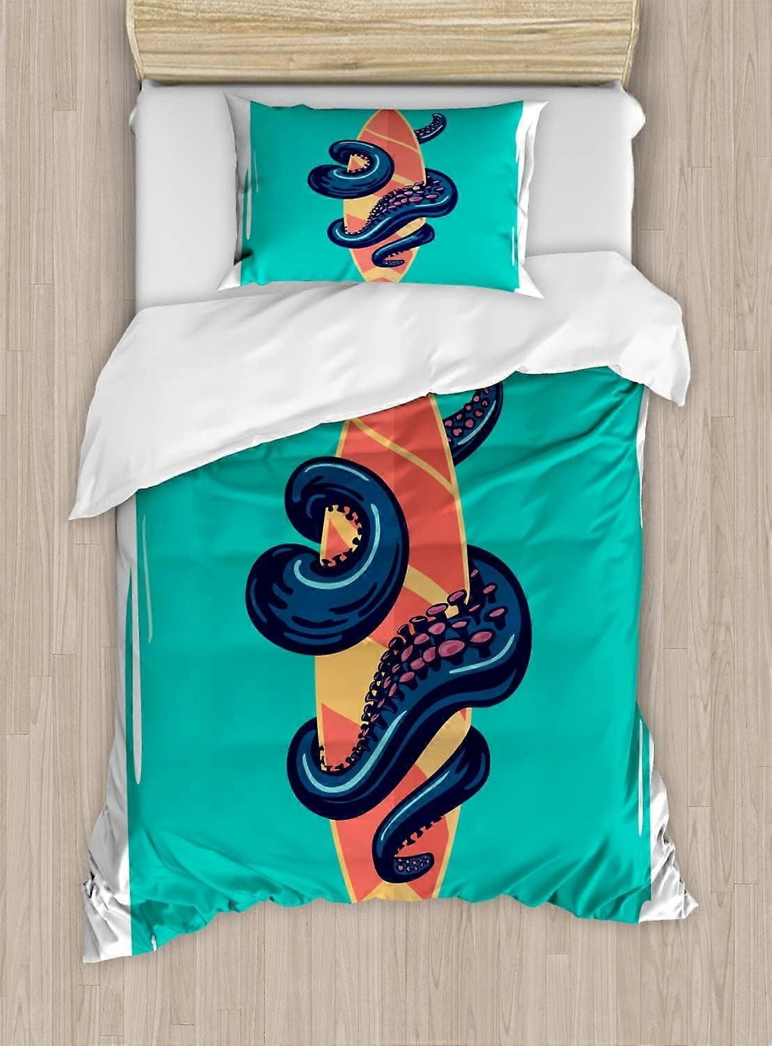 Octopus Duvet Cover 3 Pcs Set, Cephalopod Tentacles Surf Board Design with 2 Pillowcases, Orange Teal, Retro Style