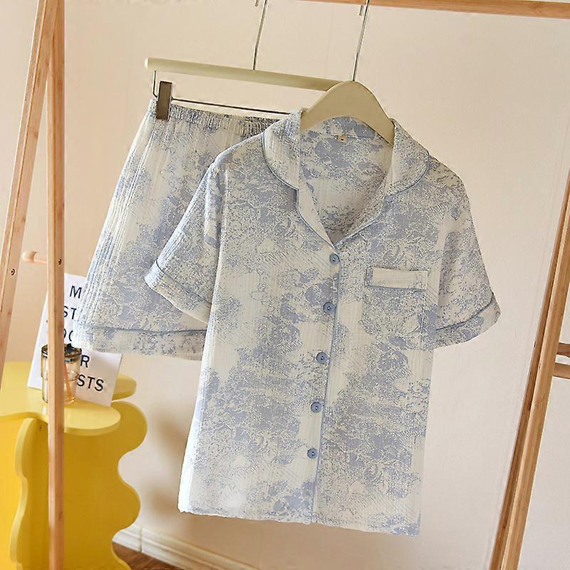 100% Cotton Pajamas For Women Vintage Printed Short Sleeve Shorts Home Suit Lapel Shirt Pant Sets Casual Sleepwear Clothes