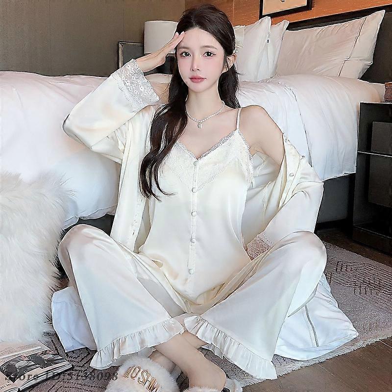 Style : Sexy<br>High-concerned chemical : None<br>Craft of Weaving : Tatting<br>Thickness : Thin<br>Length : Ankle-Length Pants<br>Season : Spring<br>Material Composition : Polyester,satin<br>Collar : round neck<br>Sleeve Length(cm) : Full<br>Pattern Type : Solid<br>Material : POLYESTER,Rayon<br>Brand Name : YZYOUTHZING<br>Origin : Mainland China<br>CN : Jiangsu<br>Gender : Women<br>Item Type : PAJAMAS<br>Size : M,L,XL<br>Color : Pink, blue, off white, purple<br>Type : Pajamas<br>Item Type : Sleepwear,Nightwear,Home Clothes,Nightgown,Intimate Lingerie,Negligee<br>Occasion : Home Wear,Casual Daily Wear, Bride Bridesmaid Wedding Wear<br>Style : Sexy,Casual,Lounge,Tempting,Vintage,Novelty,Distinctive<br>Feature : Soft,Silky,Intimate,Comfortable<br>Description : Home Clothes,Sleepwear,Nightwear,Nightgown,Pajamas<br>Support : Wholesale,Retail,Dropshipping,Cutomized<br>Place Of Origin : Shanghai,China<br>Wash Method : Wash by Hand, Hang Out to Dry<br>Season : Spring,Summer,Autumn,Winter<br>